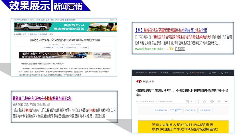 | 案例描述: | 合作模式: 品牌推广(新闻营销、问答营销、文库营销、论坛营销) 项目背景: 杭州小拇指汽车维修科技股份有限公司创立于2004年,是中国汽车后市场特许连锁经营的领军品牌。 始终坚持以诚信为品牌文化的核心,不断吸取国内外先进的技术和经验,结合中国汽车 |